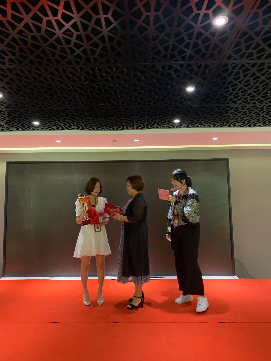 主持人在匯報完每個營銷組的業(yè)績以及排名后,接著匯報了三個店的排名以及總業(yè)績:第一名:德配裝飾;第二名:昇吉家裝飾;第三名:安欣家裝飾。