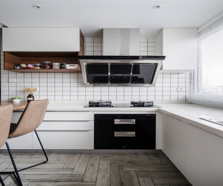 進門走廊處,做了線框內(nèi)嵌處理,拉寬過道的視覺感